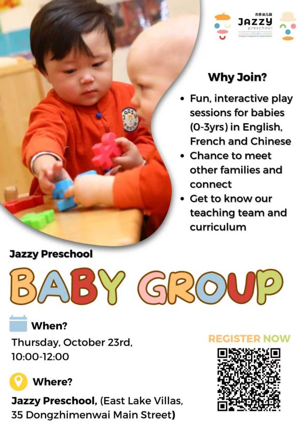 Jazzy Preschool — trilingual English, French, and Chinese kindergarten — is delighted to invite you to our Baby Group for children aged 0–3 years!