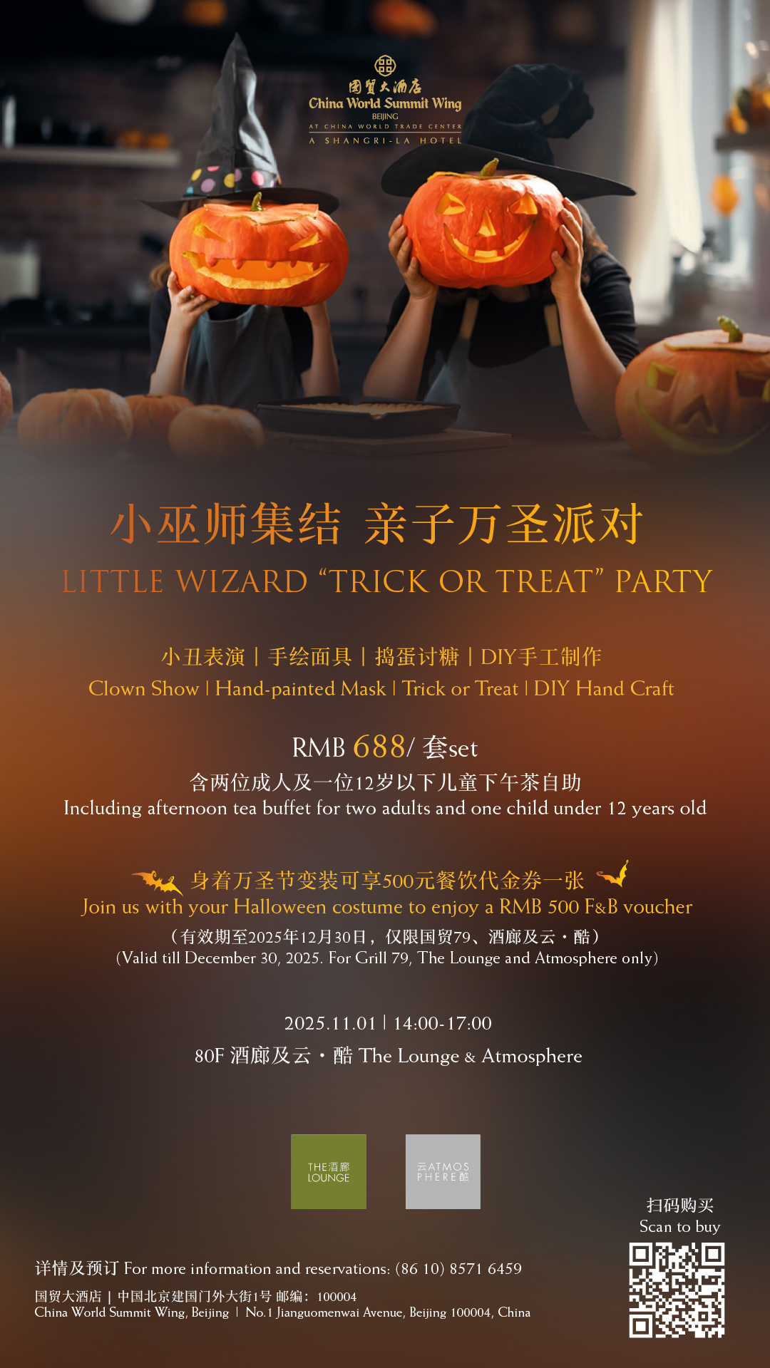 Gather your little wizards for a family-friendly Halloween 'Trick or Treat' Party! The event includes a **Clown Show**, **Hand-painted Masks**, **Trick or Treat**, and **DIY Hand Crafts**. The set price is **RMB 688/set**, which includes **afternoon tea buffet** for two adults and one child under 12 years old. Plus, **join in your Halloween costume** to receive an **RMB 500 F&B voucher**! A perfect afternoon of spooky fun for the whole family.