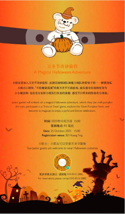 Treat your junior guests to a 'Magical Halloween Adventure' at The Peninsula Beijing! Led by the hotel's team and 'magic power,' kids will carve pumpkins, play 'trick-or-treat' games, explore a 'Pumpkin Farm,' and become a little magician. It's a fun, festive celebration designed to inspire the children's imagination and enjoy the season's cheer. Junior guests are welcome to wear Halloween costumes!
