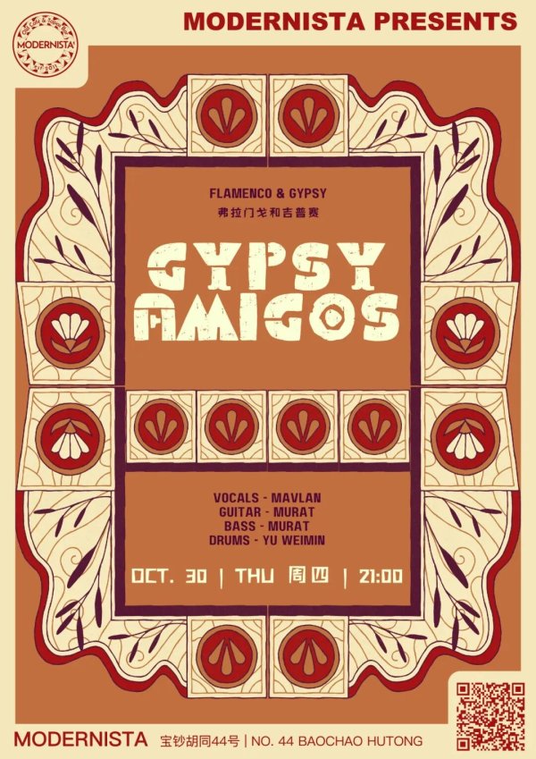 Experience the vibrant sounds of Flamenco & Gypsy music (弗拉门戈和吉普赛) with Gypsy Amigos at Modernista. This Thursday night concert features the band members: Mavlan (Vocals), Murat (Guitar), Murat (Bass), and Yu Weimin (Drums). Starting at 9:00 PM, head to Baochao Hutong for an evening of passionate, high-energy world music in a cozy atmosphere. Price information is not listed on the poster.