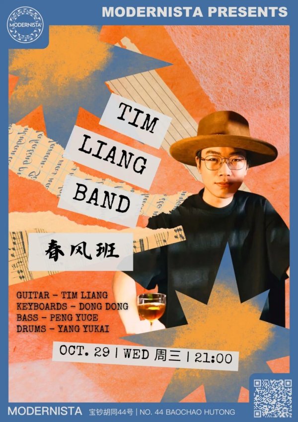 Catch a high-energy live music performance by the Tim Liang Band at Modernista! The band features Tim Liang on Guitar, Dong Dong on Keyboards, Peng Yuce on Bass, and Yang Yukai on Drums. They will be performing as 'Spring Breeze Class' (春风班). Head over on a Wednesday night for a late-night groove session in the heart of Beijing's hutongs. Entry price information is not listed on the poster, so check with the venue.