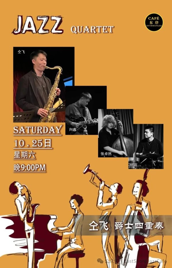 Cap off your weekend at East Shore Live Jazz on Saturday, October 25th, with the Quán Fēi Jazz Quartet! Led by masterful saxophonist Quán Fēi, the quartet delivers a classic, swinging night of straight-ahead jazz featuring guitar, bass, and drums. Join them for a pure, soulful groove and an authentic late-night atmosphere in Shichahai.