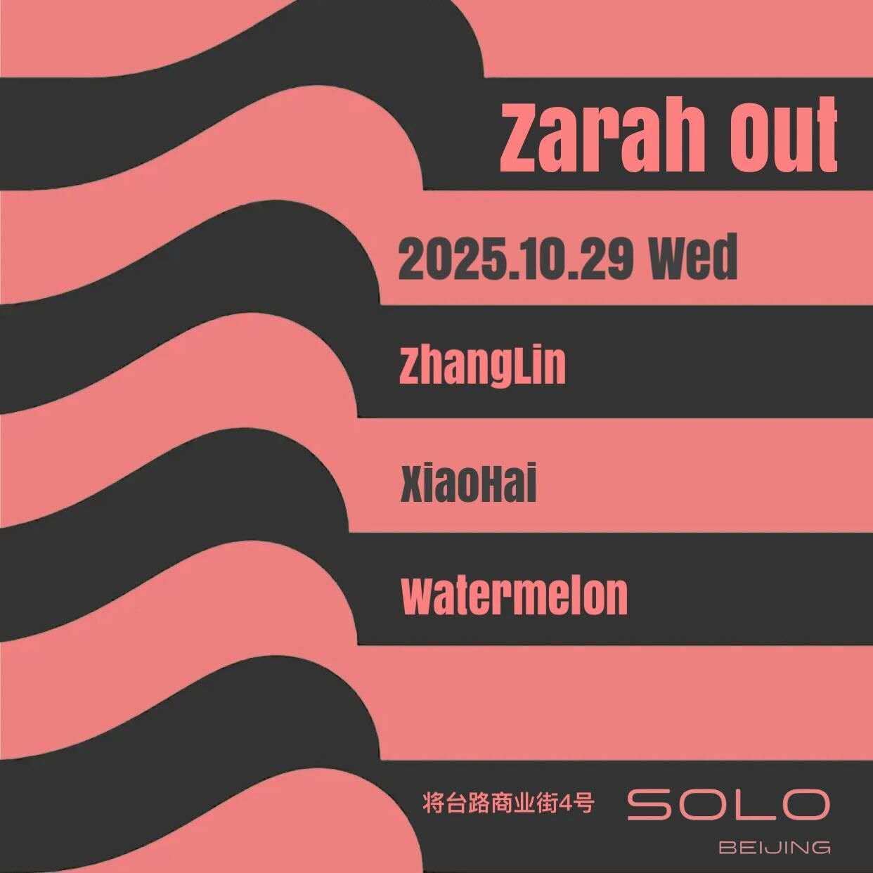 Head over to SOLO on Wednesday for a night of underground electronic music headlined by ZarAh Out. The supporting lineup includes DJs ZhangLin, XiaOHai, and Watermelon. With a minimalist design and striking pink and black aesthetic, this event promises a focused, intense club experience in the city. Date is Wednesday, October 29th. Price and exact start time are not specified on the poster.