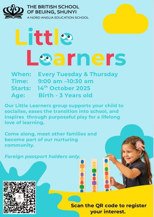 Join the Little Learners program at The British School of Beijing, Shunyi, starting October 14, 2025. Designed for children from birth to 3 years old, this program encourages socialization, eases the transition into school, and inspires a lifelong love of learning through purposeful play. Sessions run every Tuesday and Thursday from 9:00–10:30 AM. Foreign passport holders only. Scan the QR code to register.