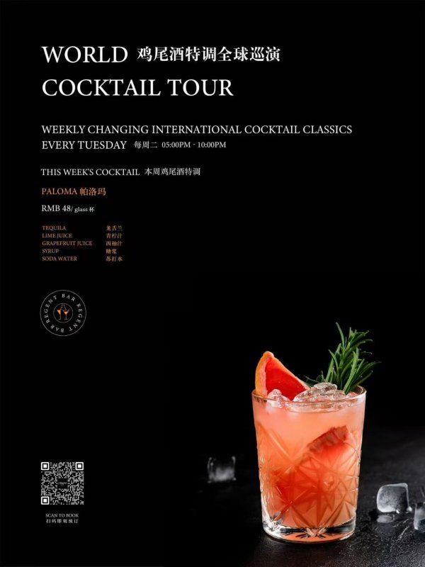 Discover the World Cocktail Tour every Tuesday, 5:00–10:00 PM at Regent Bar. Each week features a new international classic, crafted with care. This week’s highlight is the Paloma—a refreshing mix of tequila, lime juice, grapefruit juice, syrup, and soda water. Enjoy this global favorite for just RMB 48 per glass. Scan to book now!