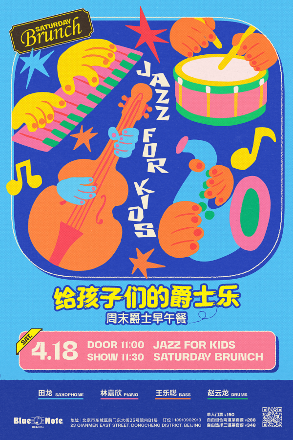 Kick off your weekend with a vibrant Saturday Brunch featuring 'Jazz for Kids' (给孩子们的爵士乐) at Blue Note Beijing. Enjoy a live quartet including saxophone, piano, bass, and drums while dining. Various set menus are available for a perfect family-friendly musical morning in the city.
